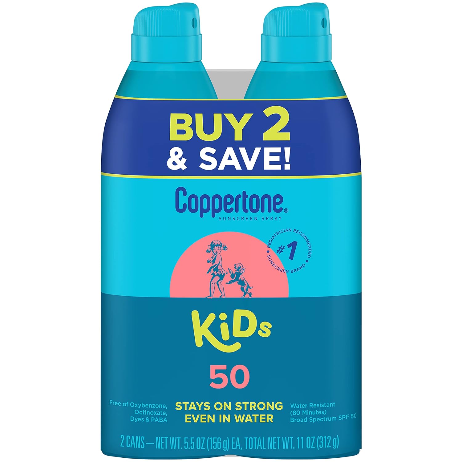 Coppertone Sunscreen Spray SPF 50, Broad Spectrum, Water Resistant for Kids, #1 Pediatrician Recommended Brand, 5.5 Ounce (Pack of 2)