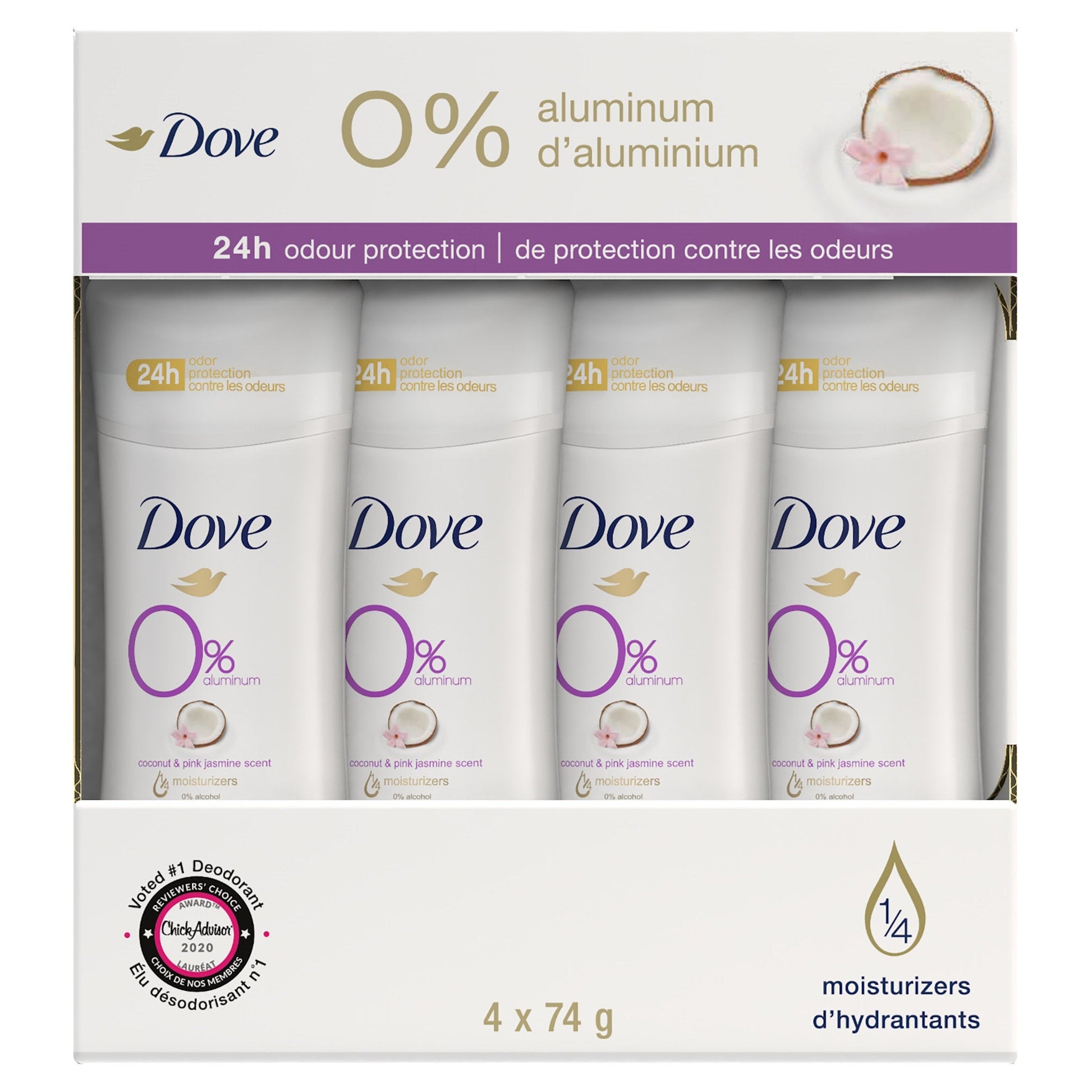 Dove 0% Deodorant Coconut and Pink Jasmine, 4 x 74 g