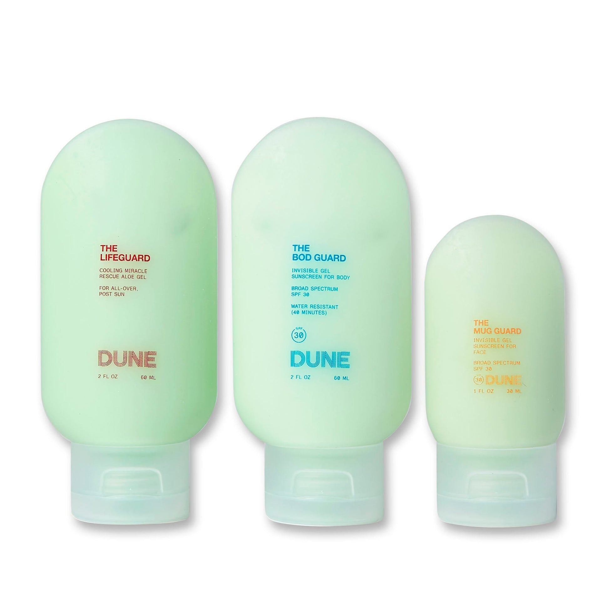 Travel friendly suncare essentials in frosted, reusable travel minis for applying suncare on the go. TSA-approved.