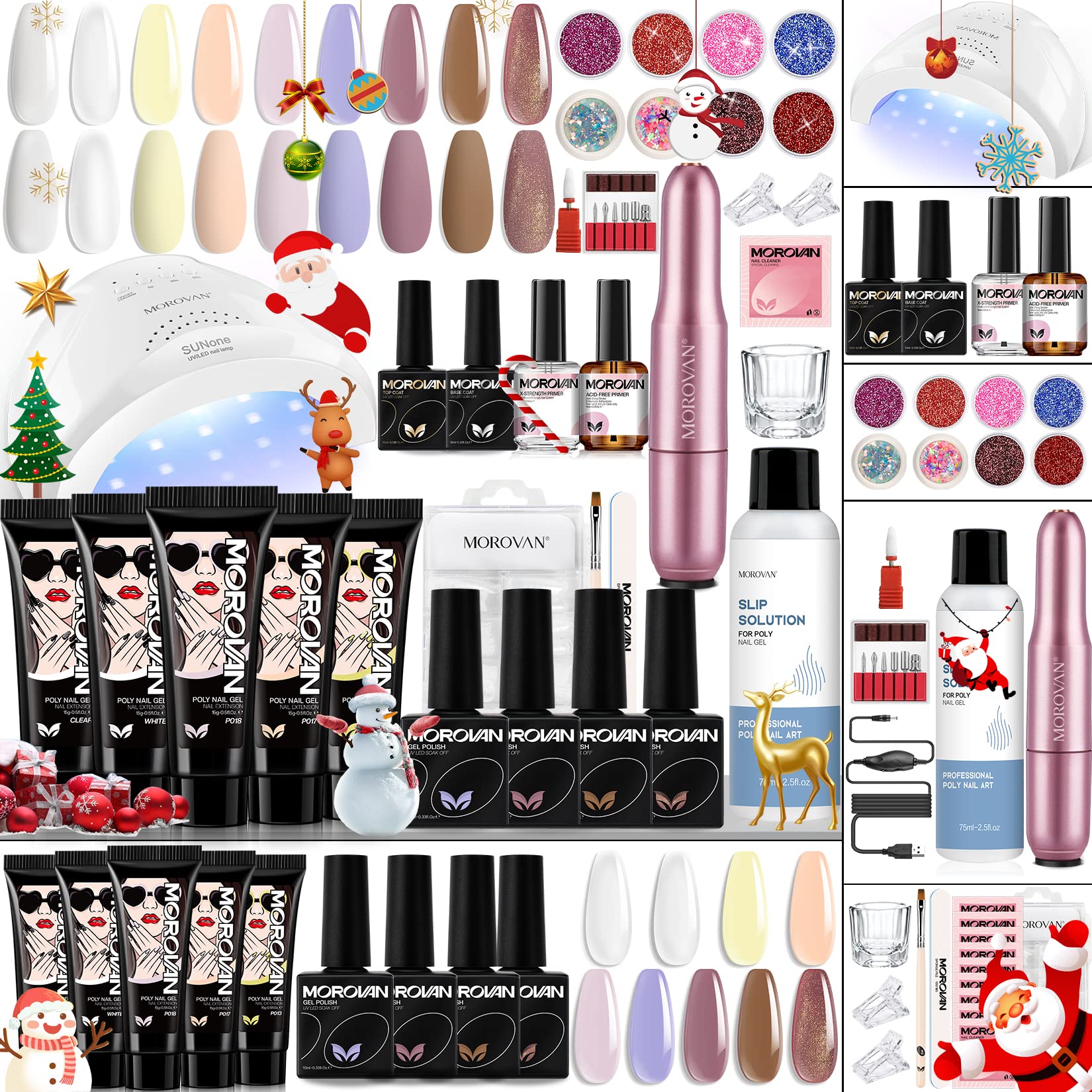 - 💘Morovan Poly Gel Nail Kit - A complete poly gel nail kit for beginners with everything. Poly Gel Nail Kit contains 5 colors poly gel, 4 colors Gel Polish, a nail drill, a nail Lamp, 8 colors Glitters, a base coat, a top coat, a nail dehydrator, an acid-free primer and a slpip solution.You can use poly gel kits to extend your nails.