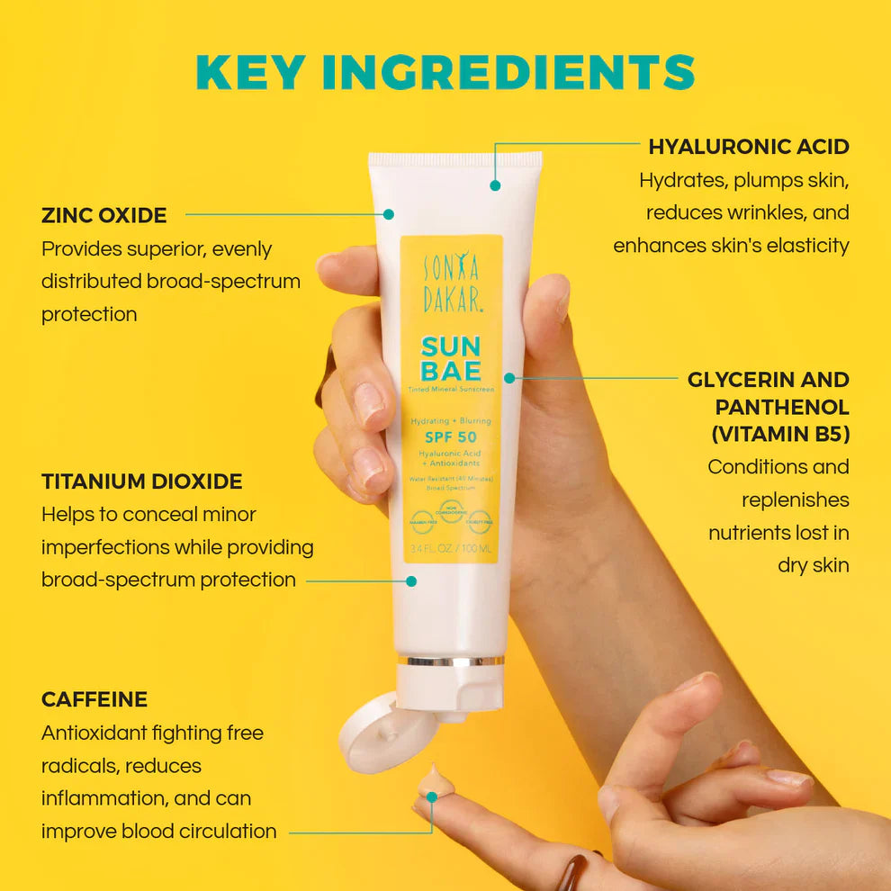 Sun Bae's tinted mineral sunscreen is enriched with powerful antioxidants like caffeine and skin-loving hyaluronic acid. Caffeine provides potent antioxidant protection, shielding your skin from environmental aggressors, while hyaluronic acid offers hydrating benefits, keeping your skin plump and moisturized.